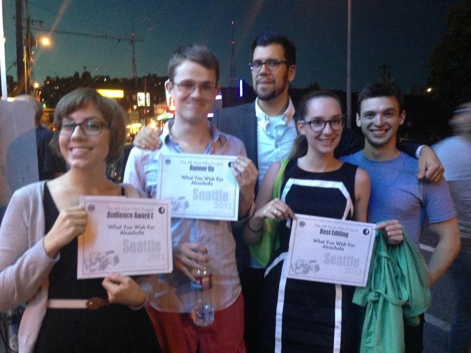 The 48 Hour Film Festival is an annual event where film makers form groups and create movies (concept to final render) in 48 hours. I've participated in the Seattle event with two small production crews, Team Alcachofa and Nornir Productions, since 2012 and have won multiple awards including Best Editing and Runner-up City of Seattle. At one time or another (and often simultaneously) I've acted as director, cinematographer, grip, gaffer, editor, special effects artist, sound mixer, critic, and coffee-fetcher.