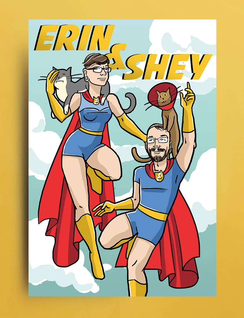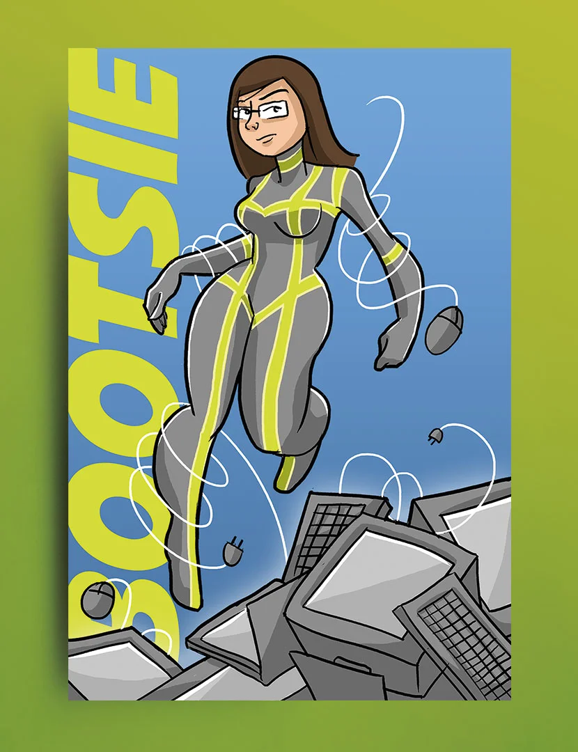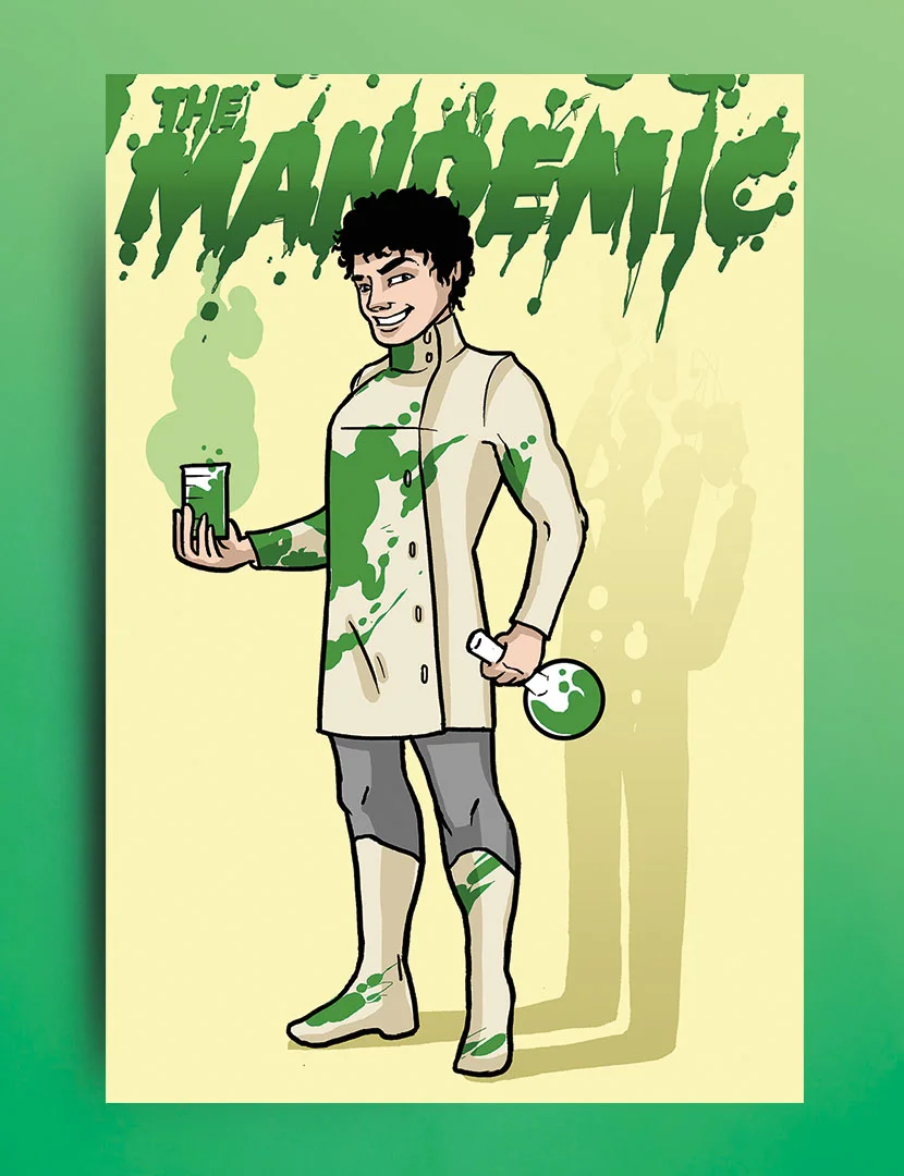 These are part of an ongoing series of comic book-style portraits of my friends and family. I typically get no input from the subject on how they want to be depicted (with the exception of The Mandemic, who came up with his own evil name and was too good to pass on), and instead draw from small pieces of their personalities. All are sketched and colored digitally.