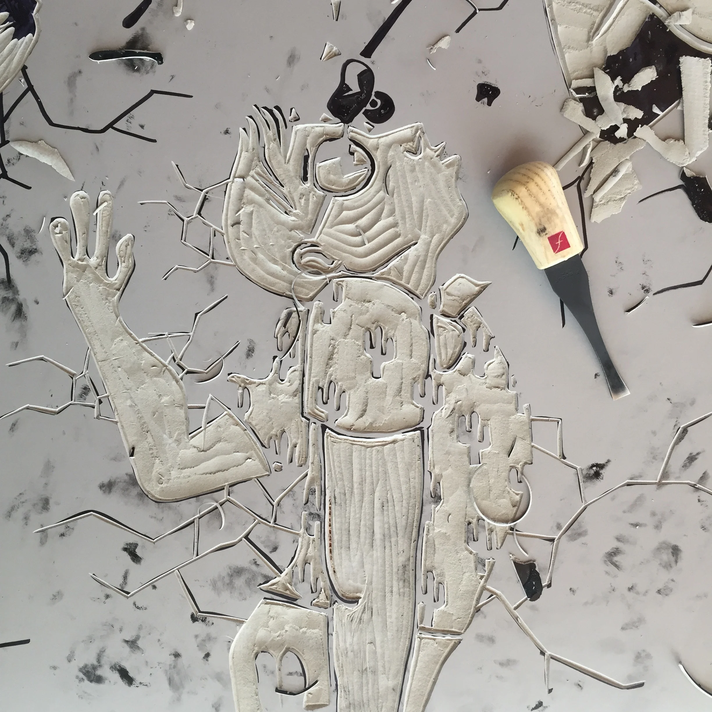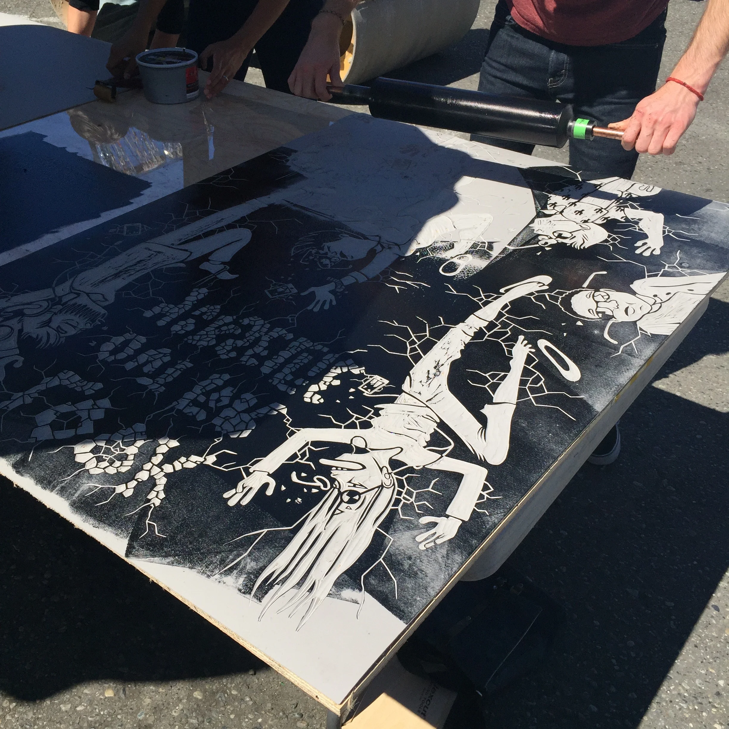 The Steamroller Smackdown is an annual event in Seattle co-presented by SVC and the South Lake Union Block Party. 20 teams are given hour-long slots to create as many 4ft tall posters as they can, letter-pressed by a mini steamroller. The theme for 2015 was "man vs. machine", and I decided to illustrate it literally. Our poster was the members of the Intentional Futures design team, smashed flat by the roller.